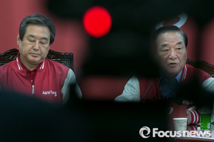 (서울=포커스뉴스) 서청원(오른쪽) 새누리당 최고위원이 7일 오전 서울 여의도 당사에서 공동선대위원장 긴급회의에 참석해 발언하는 동안, 김무성 대표가 생각에 잠겨 있다.