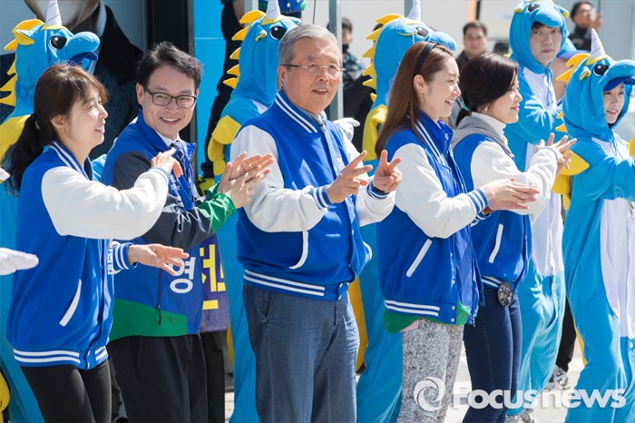 (춘천=포커스뉴스) 7일 강원도 춘천풍물시장 인근에서 김종인 더불어민주당 비대위 대표와 허영 더불어민주당 춘천 후보가 유권자들에게 지지를 호소하고 있다.