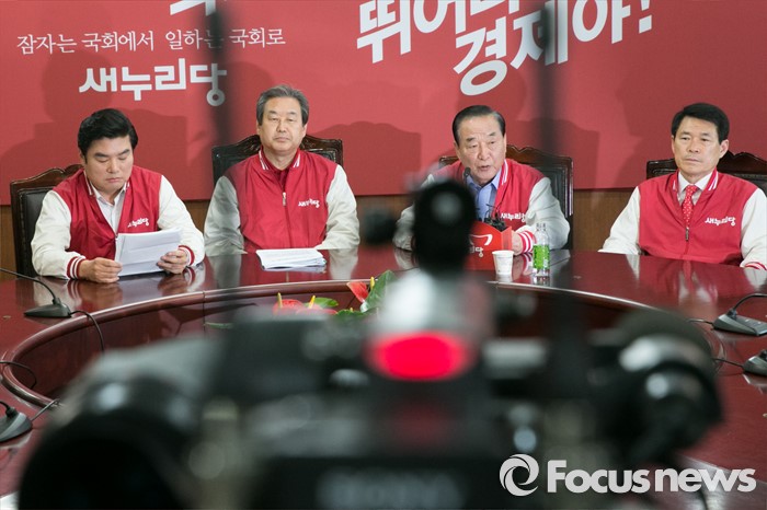 (서울=포커스뉴스) 7일 오전 서울 여의도 새누리당사에서 공동선대위원장 긴급회의가 열리고 있다. 왼쪽부터 원유철 원내대표, 김무성 대표, 서청원 최고위원, 이군현 공동총괄본부장.