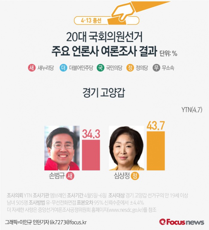 (서울=포커스뉴스) YTN이 여론조사기관 엠브레인에 의뢰해 7일 발표한 결과에 따르면 경기 고양갑에서 새누리당 손범규 후보의 지지율은 34.3%, 정의당 심상정 후보의 지지율은 43.7%인 것으로 나타났다.