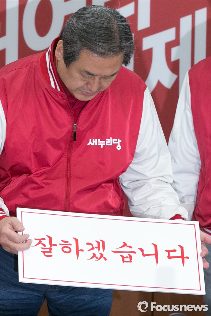 (서울=포커스뉴스) 김무성 새누리당 대표가 7일 오전 서울 여의도 당사에서 열린 공동선대위원장 긴급회의에 참석해, 투표독려 홍보문구를 보고 있다.
