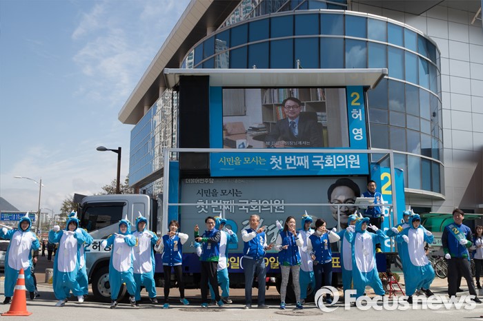 (춘천=포커스뉴스) 7일 강원도 춘천풍물시장 인근에서 김종인 더불어민주당 비대위 대표와 허영 더불어민주당 춘천 후보가 유권자들에게 지지를 호소하고 있다.