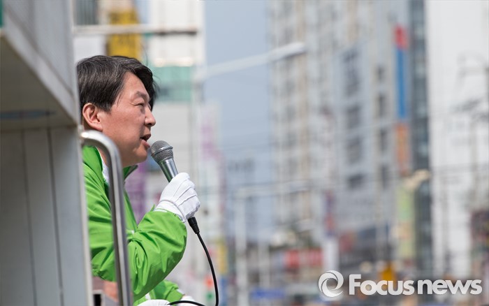 (하남=포커스뉴스) 7일 오후 경기 하남 신장시장 앞에서 안철수 국민의당 상임공동대표가 유형욱 국민의당 하남시 후보 지원유세를 하고 있다.