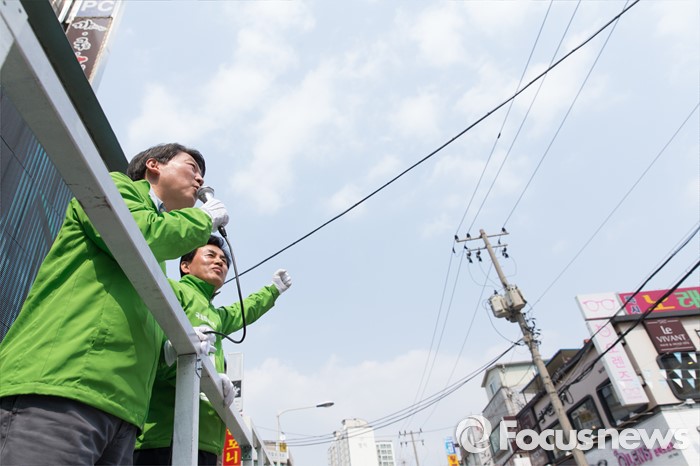 (하남=포커스뉴스) 7일 오후 경기 하남 신장시장 앞에서 안철수 국민의당 상임공동대표가 유형욱 국민의당 하남시 후보 지원유세를 하고 있다.