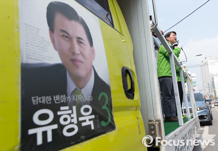 (하남=포커스뉴스) 7일 오후 경기 하남 신장시장 앞에서 안철수 국민의당 상임공동대표가 유형욱 국민의당 하남시 후보 지원유세를 하고 있다.