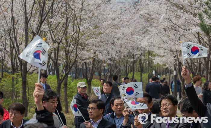 (서울=포커스뉴스) 7일 오후 서울 마포구 늘장공원에서 열린 안대희 새누리당 마포갑 후보 집중유세장에 모인 시민들이 태극기를 흔들며 지지를 보내고 있다.