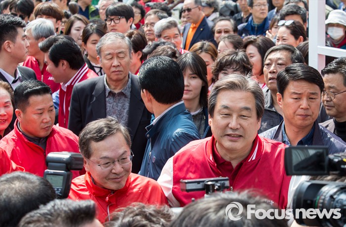 (서울=포커스뉴스) 7일 오후 서울 마포구 늘장공원에서 열린 안대희 새누리당 마포갑 후보 집중유세에 참석한 김무성 대표와 안 후보가 차량으로 향하고 있다.