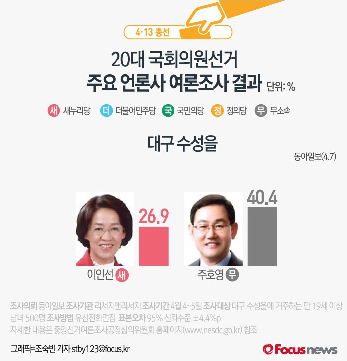 동아일보 여론조사는 4~5일 대구 수성을에 거주하는 만 19세 이상 남녀 500명을 대상 유선전화접조사 방식으로 진행됐다. 표본오차는 95% 신뢰 수준에 ±4.4%p다.