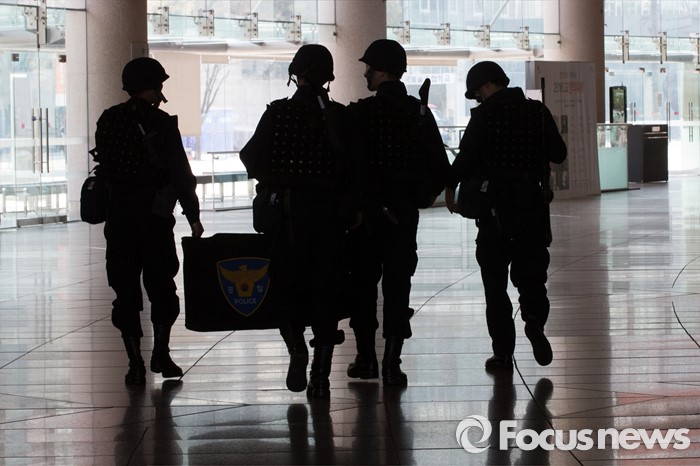 (서울=포커스뉴스) 7일 오후 서울 서초구 예술의전당 음악당에서 열린 유관 기관 합동 대테러훈련에서 경찰들이 폭발 의심물을 처리하고 있다. 이번 훈련은 공연 도중 폭발 의심물체가 발견된 상황을 설정해 훈련을 진행했다.