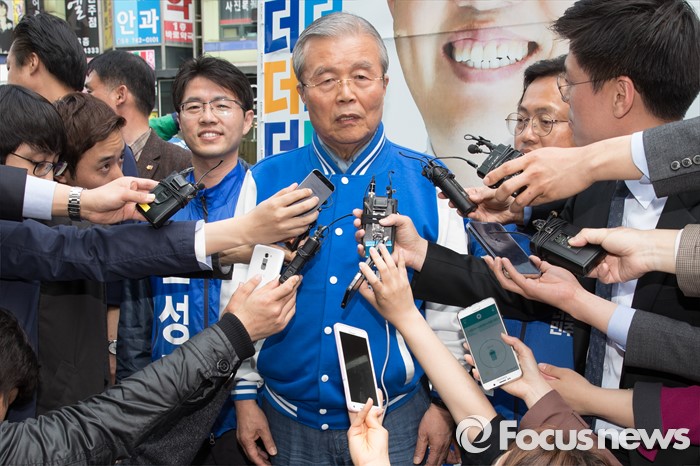 (원주=포커스뉴스) 김종인 더불어민주당 비대위 대표가 7일 오후 강원도 원주중앙시장 인근에서 송기헌 더불어민주당 원주을 후보, 권성중 더불어민주당 원주갑 후보와 유세를 마치고 취재진의 질문에 답변을 하고 있다.