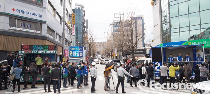 (원주=포커스뉴스) 7일 오후 강원도 원주중앙시장 인근에서 송기헌 더불어민주당 원주을 후보, 김종인 더불어민주당 비대위 대표, 권성중 더불어민주당 원주갑 후보가 유권자들에게 지지를 호소하고 있다.