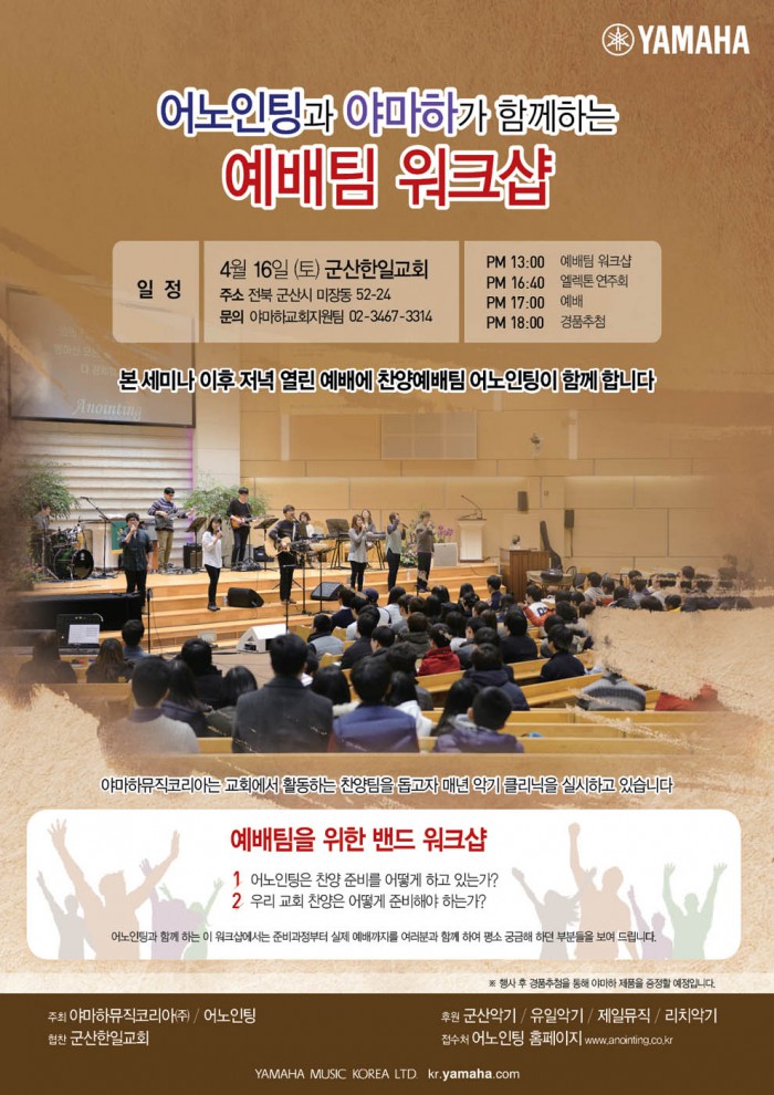 야마하뮤직코리아 교회지원팀 조광래 팀장은 "큰 교회에 비해 규모가 작은 교회는 시설, 장비 등의 열악한 환경으로 제대로 된 찬양이 이뤄지는 데 어려움을 겪어 이번 교회 예배 워크숍을 통해 그간의 문제점을 해결 할 좋은 기회가 될 것"이라며 "앞으로도 다양한 지원과 교육프로그램을 통해 교회 발전을 위해 지속적인 노력을 펼쳐나가겠다"고 밝혔다.'교회 예배팀 워크숍' 개최를 알리는 포스터.<사진제공=야마하뮤직코리아>
