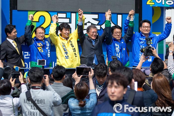 (인천=포커스뉴스) 문재인 더불어민주당 전 대표가 7일 오후 인천광역시 지하철1호선 주안역 남광장에서 열린 인천 지역 합동유세를 마친 뒤 김성진(왼쪽 세 번째) 정의당 인천광역시 남구을 후보 및 더불어민주당 인천 지역 후보들과 손을 맞잡고 있다.