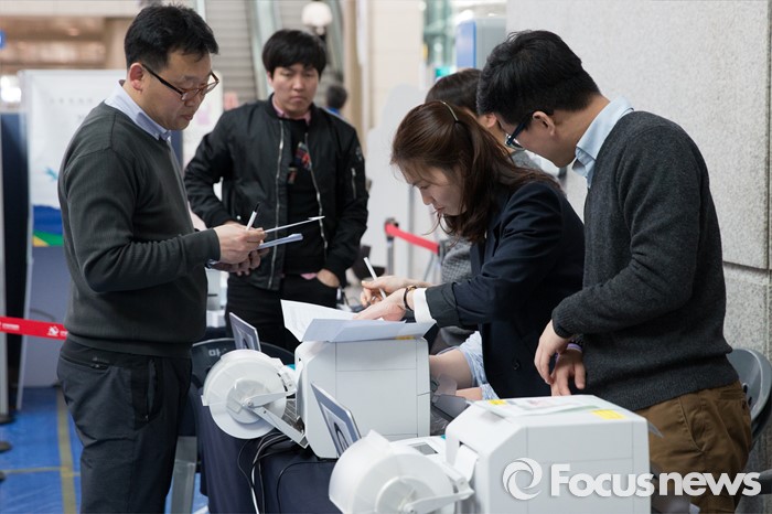(인천공항=포커스뉴스) 제20대 국회의원 선거 사전투표를 하루 앞둔 7일 오후 인천국제공항 출국장에서 인천 선거관리위원회 관계자들이 사전투표소 설치 후 점검하고 있다.