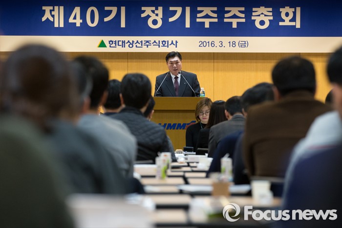 현대상선측은 "산은과 맺은 자율협약은 선주 및 사채권자를 포함한 모든 비협약 채권자의 공평한 채무조정을 전제로 맺은 조건부 협약이기 때문에, 모든 이해관계자들의 공평한 손실 분담을 통한 채무조정이 뒷받침돼야 한다"고 강조했다.(서울=포커스뉴스) 이백훈 현대상선 대표이사가 18일 오전 서울 종로구 현대그룹빌딩에서 열린 제40기 정기주주총회에서 인사말을 하고 있다. 2016.03.18 허란 기자