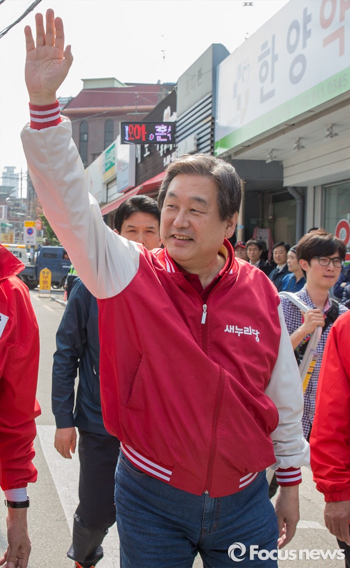 (서울=포커스뉴스) 7일 오후 서울 성북구 장위시장 앞에서 열린 김효재 새누리당 성북구을 후보 지원유세에 나선 김무성 대표가 유권자들의 지지를 호소하고 있다.