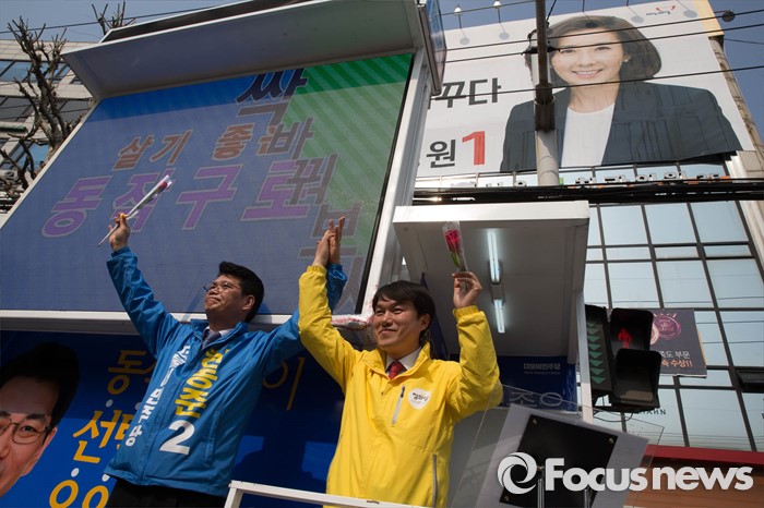 (서울=포커스뉴스) 20대 총선을 6일 앞둔 7일 오후 서울 동작구 남성역 골목시장 인근에서 허동준 더불어민주당 동작구을 후보와 김종철 정의당 후보와 후보 단일화에 합의하고 손을 들어올리고 있다.