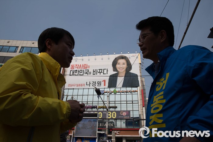 (서울=포커스뉴스) 20대 총선을 6일 앞둔 7일 오후 서울 동작구 남성역 골목시장 인근에서 허동준 더불어민주당 동작구을 후보가 김종철 정의당 후보와 이야기 하고 있다.
