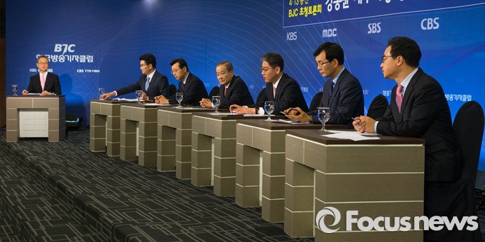 (서울=포커스뉴스) 7일 오후 서울 종로구 세종문화회관에서 열린 한국방송기자클럽 초청토론회에 참석한 강봉균(왼쪽 네번째) 새누리당 공동선거대책위원장이 패널들과 토론을 하고 있다.