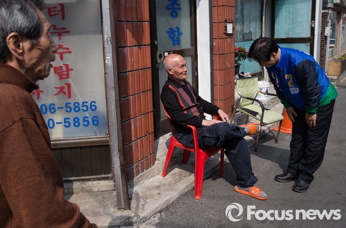 (서울=포커스뉴스) 이용선 더불어민주당 양천구을 후보가 7일 오후 서울 양천구 신월동 신월시장에서 선거운동을 하고 있다.