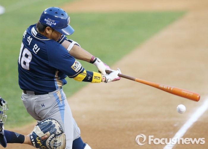 (서울=포커스뉴스) 7일 서울 잠실구장에서 열린 2016 프로야구 NC-두산 경기 1회초 2사 1,2루에서 NC 박석민이 우익선상으로 빠지는 2타점 2루타를 치고 있다.