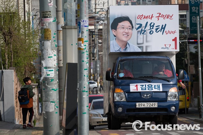 (서울=포커스뉴스) 김용태 새누리당 양천구을 후보가 7일 오후 서울 양천구 신월동 일대에서 선거운동을 하고 있다.