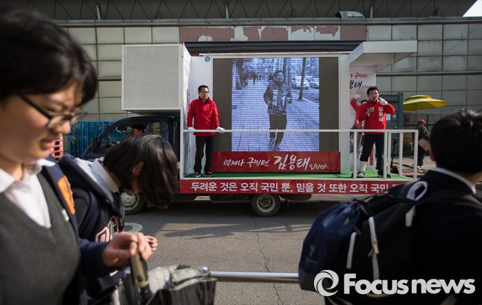 (서울=포커스뉴스) 김용태 새누리당 양천구을 후보가 7일 오후 서울 양천구 신월동 일대에서 선거운동을 하고 있다.