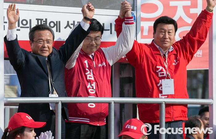 | △ 손 들어 인사하는 김성동 후보 |