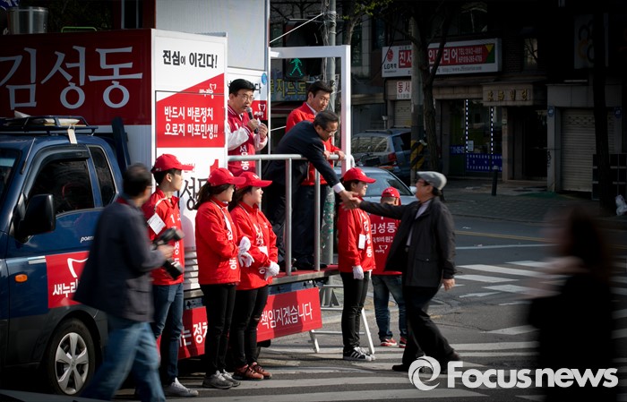 (서울=포커스뉴스) 20대 총선에 출마하는 김성동 새누리당 서울 마포을 후보의 선거운동원들이 7일 오후 서울 경성고등학교 앞 사거리에서 선거유세를 하고 있다.