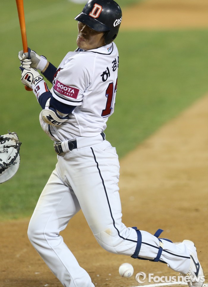 (서울=포커스뉴스) 7일 서울 잠실구장에서 열린 2016 프로야구 NC-두산 경기 4회말 2사 3루에서 두산 허경민이 NC 투수 해커의 투구에 옆구리를 맞고 있다.