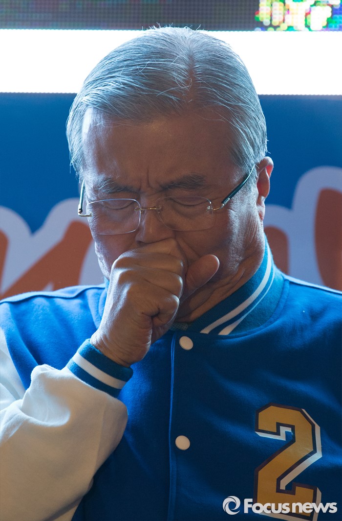 (청주=포커스뉴스) 김종민 더불어민주당 대표가 7일 오후 충북 청주 상당구 성안길에서 지원유세 중 기침을 하고 있다.