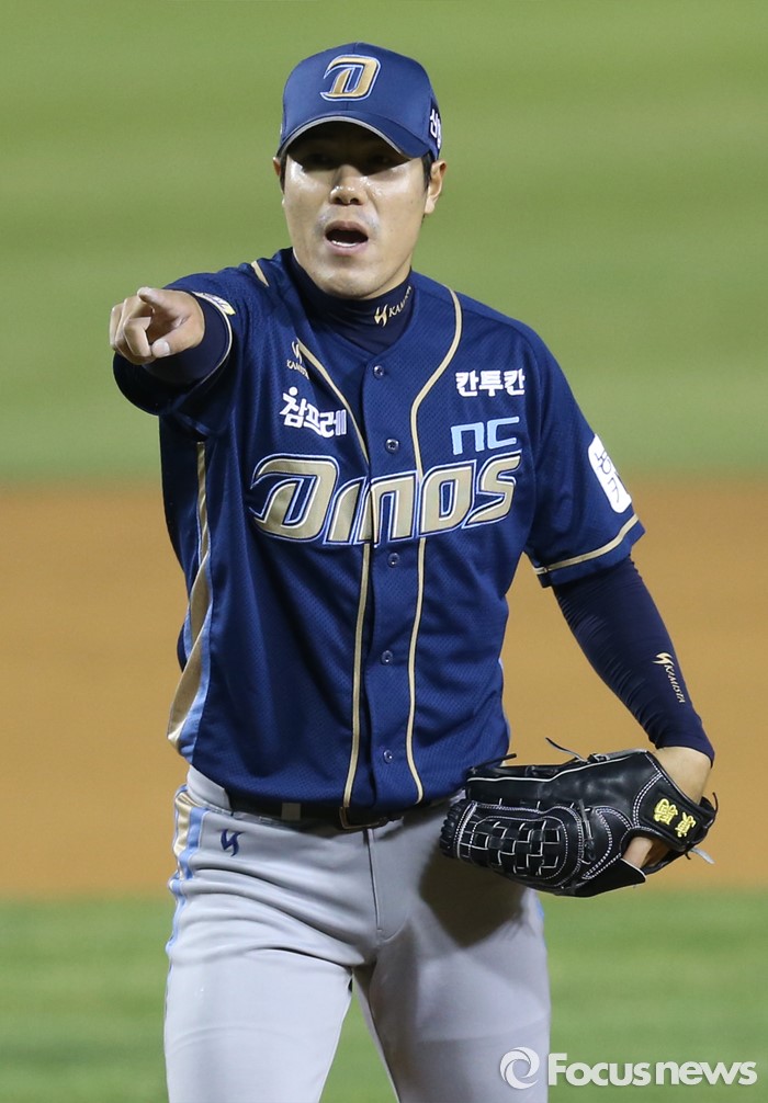 (서울=포커스뉴스) 7일 서울 잠실구장에서 열린 2016 프로야구 NC-두산 경기에서 9회 등판한 NC 투수 김진성이 패스트볼을 던진후 포수에게 볼의위치를 가리키고 있다.