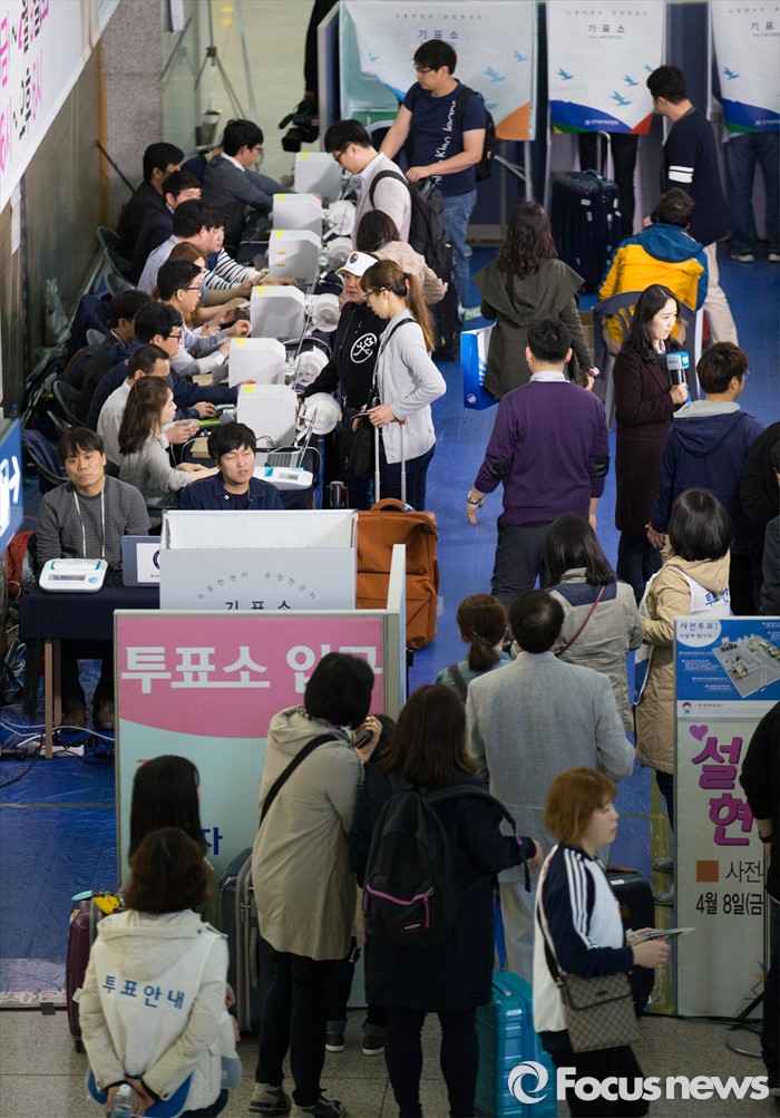 (인천공항=포커스뉴스) 제20대 국회의원 선거 사전투표 시작일인 8일 오전 인천국제공항 출국장에서 유권자들이 사전투표를 하고 있다.