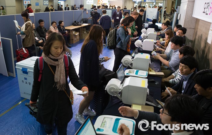 (인천공항=포커스뉴스) 제20대 국회의원 선거 사전투표 시작일인 8일 오전 인천국제공항 출국장에서 유권자들이 투표용지를 받기 위해 신원확인을 하고 있다.