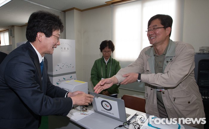 (대구=포커스뉴스) 20대 총선을 닷새 앞둔 유승민 무소속(대구 동을) 후보가 8일 오전 대구 북구 산격3동 주민센터에 마련된 사전투표소에서 투표에 앞서 투표관리관과 인사하고 있다.