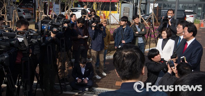 (대구=포커스뉴스) 무소속 유승민, 권은희, 류성걸 후보가 8일 오전 대구 북구 산격3동 주민센터에 마련된 사전투표소에서 사전투표를 마치고 기자회견을 하고 있다.