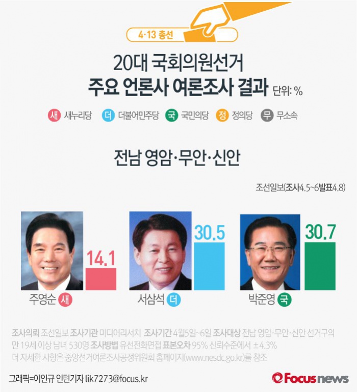 (서울=포커스뉴스) 조선일보가 여론조사기관 미디어리서치에 의뢰해 8일 발표한 결과에 따르면 전남 영암 무안 신안의 지지율은 새누리당 주영순 후보(14.1%), 더불어민주당 서삼석 후보(30.5%), 국민의당 박준영 후보(30.7%)순인 것으로 나타났다.