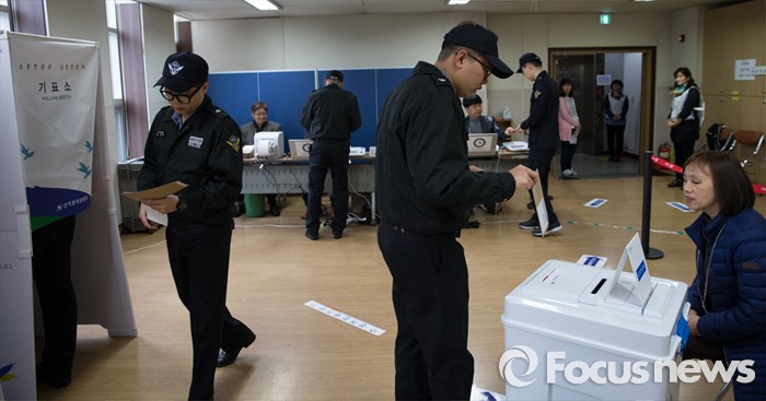 (인천=포커스뉴스) 제20대 국회의원 선거 사전투표 시작일인 8일 오전 인천 연수구 송도1동 주민센터에서 인천 중부해양경비안전본부 소속 해경들이 사전투표를 하고 있다.