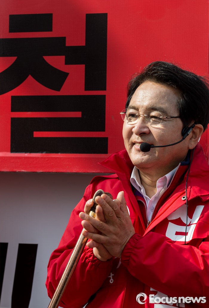 (안양=포커스뉴스) 8일 오전 경기 안양시 범계역 인근에서 열린 심재철 새누리당 안양동을 후보 지원유세에서 심 후보가 박수치고 있다.