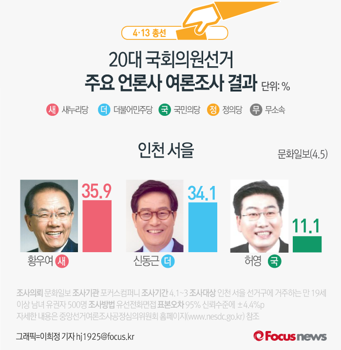 앞서 문화일보가 여론조사기관 포커스컴퍼니에 의뢰해 5일 발표한 결과에 따르면 인천 서을의 후보지지도는 황우여 후보(35.9%), 신동근 후보(34.1%)로 나타났다.