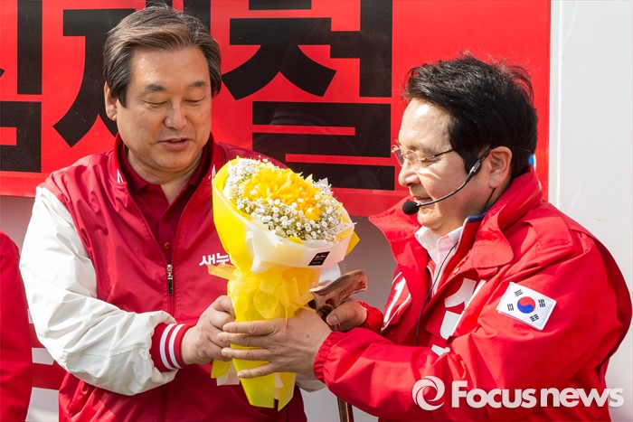 (안양=포커스뉴스) 8일 오전 경기 안양시 범계역 인근에서 심재철 새누리당 안양동을 후보 지원유세에 나선 김무성 대표가 심 후보에게 꽃다발을 건네고 있다.