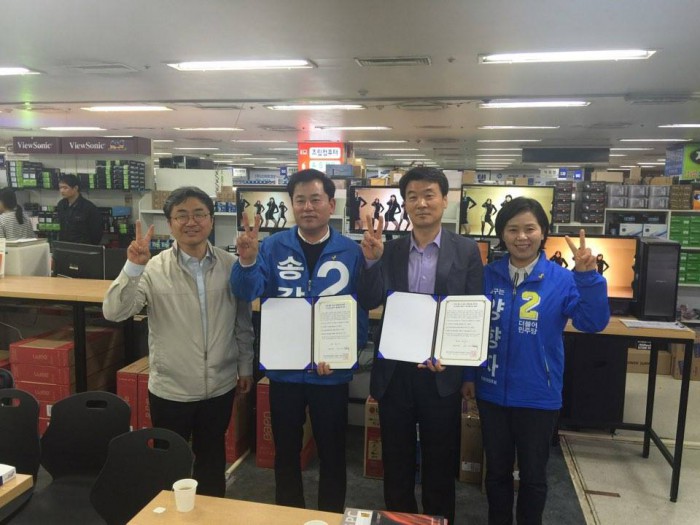 송갑석 후보는 이날 금호월드 상인들과 △카드수수료 추가인하 또는 수수료율 1% 균등화 적극 추진 △서구상권의 사후면세점 활성화 적극 지원 △중소상공인적합업종특별법 제정 위해 적극 노력 △재벌대기업 복합쇼핑몰, 대형마트 입점규제 등 내용이 담긴 정책협약을 맺었다.7일 광주 금호월드를 방문한 더불어민주당 송갑석 후보(광주 서구갑)와 양향자 후보(광주 서구을)가 상인들과 정책협약을 맺은 후 사진 촬영을 하고 있다 <사징출처=송갑석 후보 페이스북>