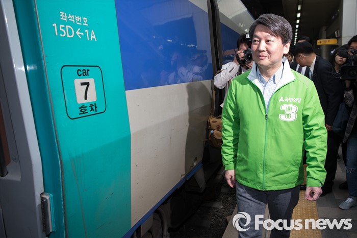 (서울=포커스뉴스) 4.13총선 사전투표 첫째날인 8일 오전 서울 용산구 서울역에서 안철수 국민의당 상임공동대표가 사전투표 격려 후 대전으로 가는 KTX를 탑승하고 있다.