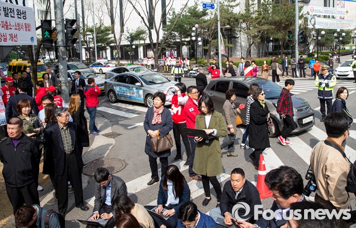 (안양=포커스뉴스) 8일 오전 경기 안양시 범계역 인근에서 열린 심재철 새누리당 안양동을 후보 지원유세현장의 교통이 혼선을 빚고 있다.