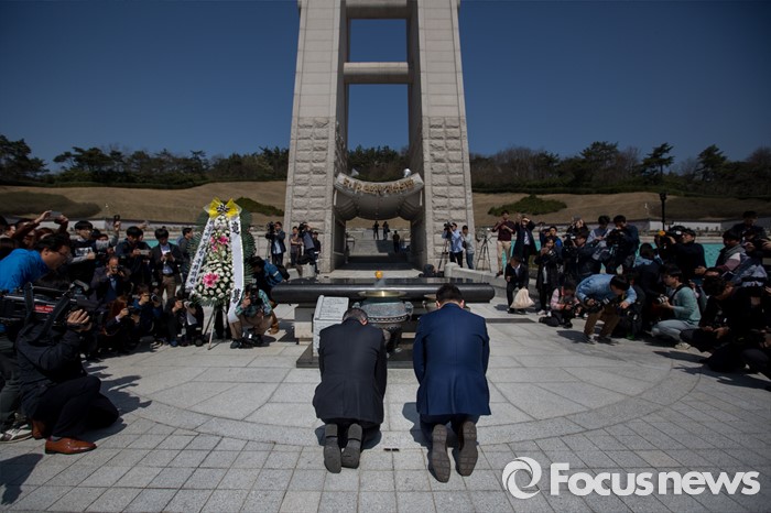 (광주=포커스뉴스) 문재인 더불어민주당 전 대표와 김홍걸 국민통합위원장이 8일 오전 전남 광주 5.18 민주항쟁 추모탑을 찾아 무릎을 꿇고 참배 하고 있다.