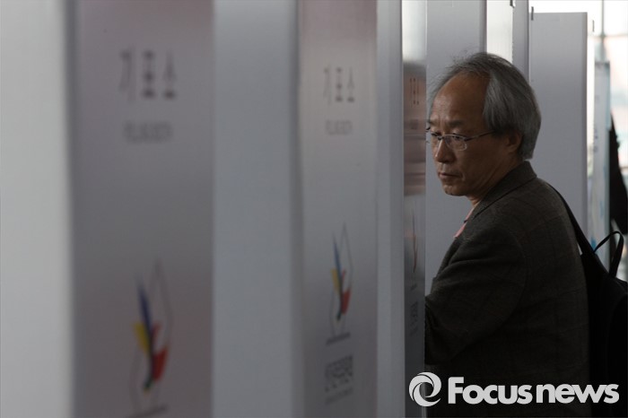 (서울=포커스뉴스) 4.13총선 사전투표 첫째날인 8일 오전 서울 용산구 서울역에 설치된 남영동 사전투표소에서 시민들이 투표를 하고 있다. 사전투표는 4.8~4.9일까지 진행된다.
