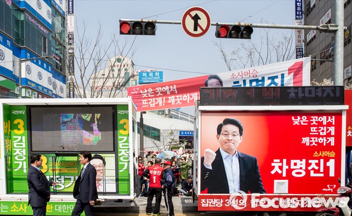 (부천=포커스뉴스) 8일 오전 경기 부천시 역곡역 인근에서 열린 차명진 새누리당 부천소사구 후보 지원유세에서 차 후보 유세차량 옆에 김정기 국민의당 후보 차량이 함께 주차돼 있다.