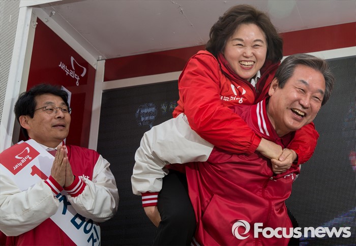 (부천=포커스뉴스) 8일 오전 경기 부천시 역곡역 인근에서 차명진 새누리당 부천소사구 후보 지원유세에서 나선 김무성 대표가 이음재 부천원미갑 후보를 업어주고 있다.