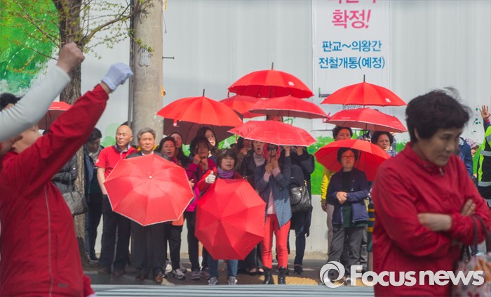 (안양=포커스뉴스) 8일 오전 경기 안양시 비산사거리 인근에서 열린 권용준 새누리당 안양동안갑 후보 지원유세에서 붉은 우산을 쓴 지지자들이 유세를 경청하고 있다.