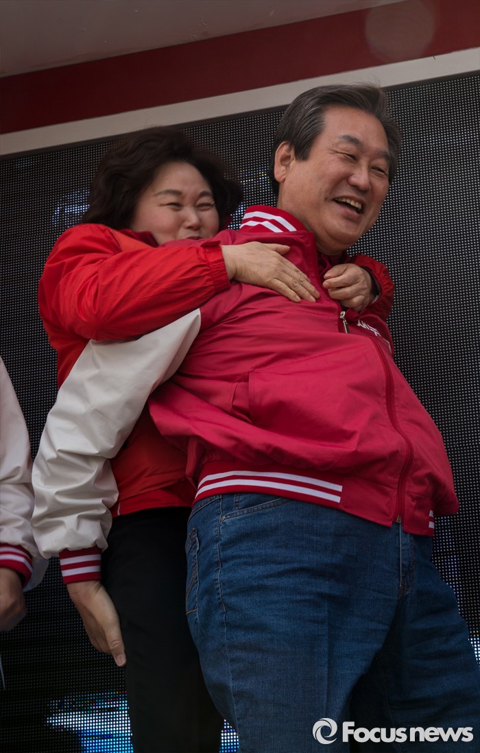(부천=포커스뉴스) 8일 오전 경기 부천시 역곡역 인근에서 차명진 새누리당 부천소사구 후보 지원유세에서 나선 김무성 대표가 이음재 부천원미갑 후보를 업어주고 있다.
